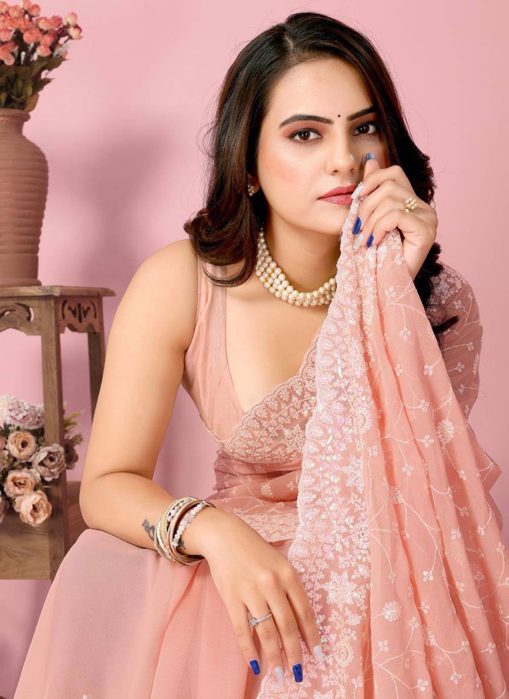 Bring out the true diva in you and reinvent your true self. Add grace and charm to your appearance in this beautiful peach georgette saree. The lovely embroidered work throughout the attire is awe inspiring. Comes with matching blouse.