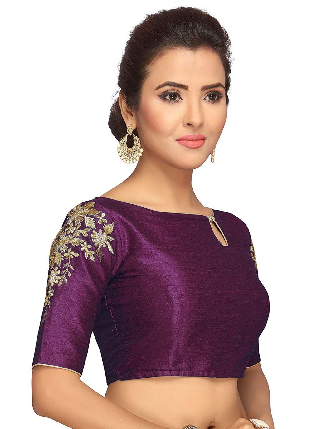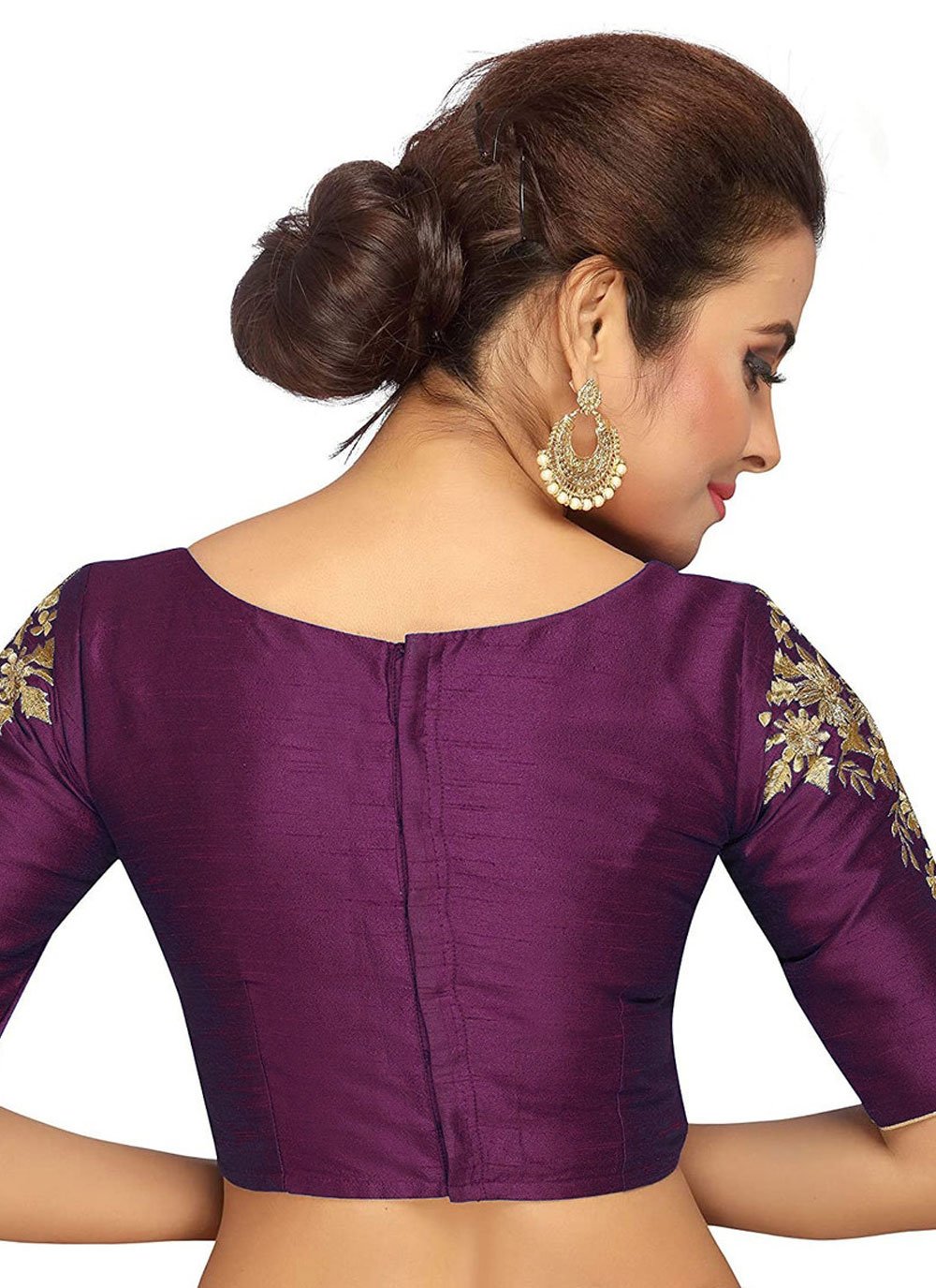 Recreate a magical aura with this purple color dupion silk fabric ready made blouse. Nice plain at all over.Accessories shown in the image are for presentation purposes only. (Slight variation in the actual color vs. Image is possible).