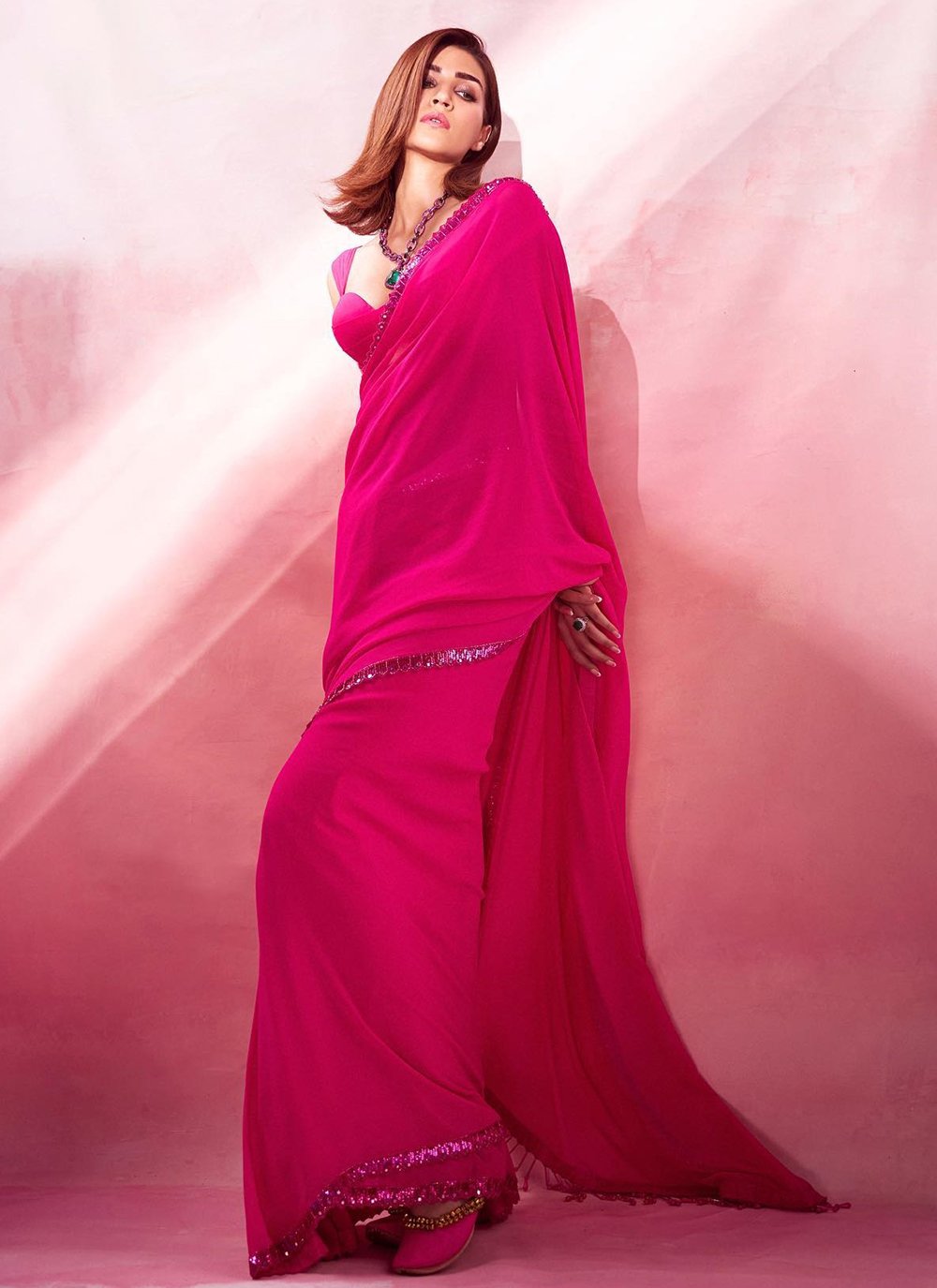 Its a master piece in its class glorifying your timeless beauty. Be ready to slip in the comfort zone of hot pink georgette trendy saree. The lovely cutwork and lace work throughout the attire is awe inspiring. Comes with matching blouse.